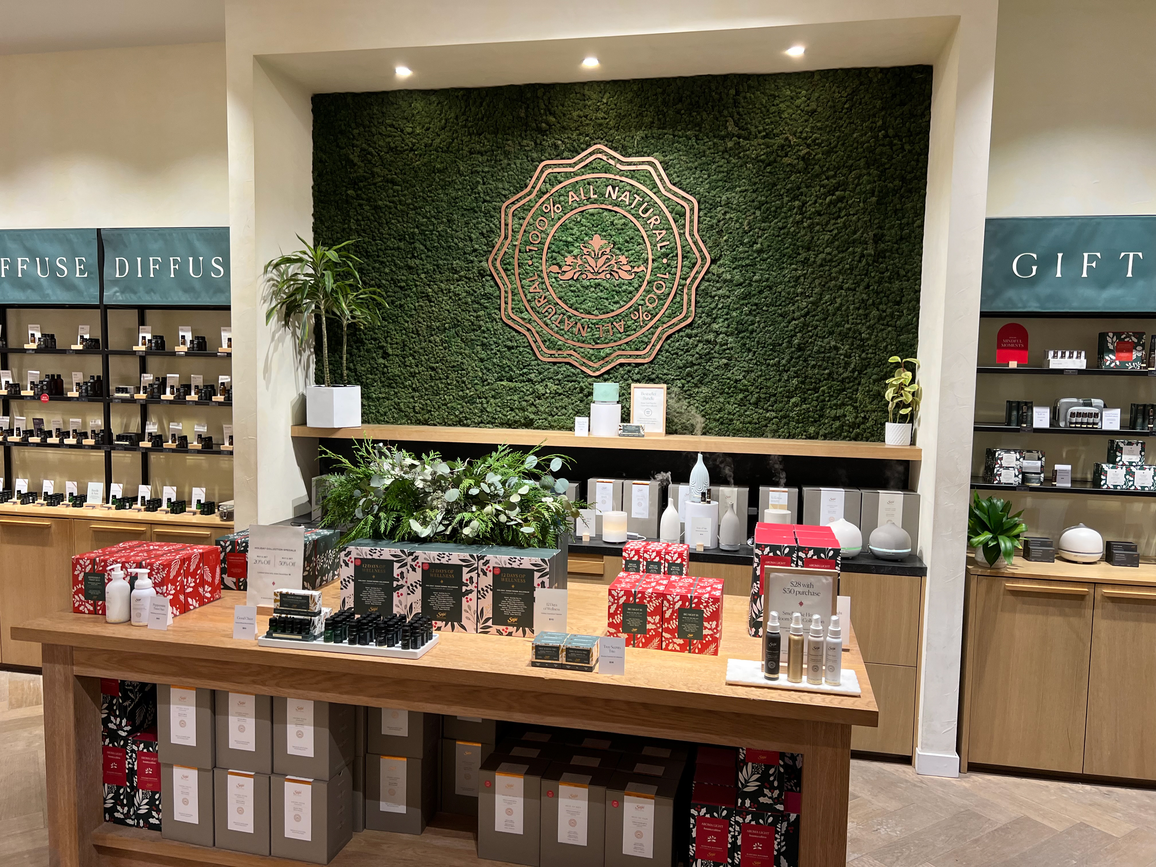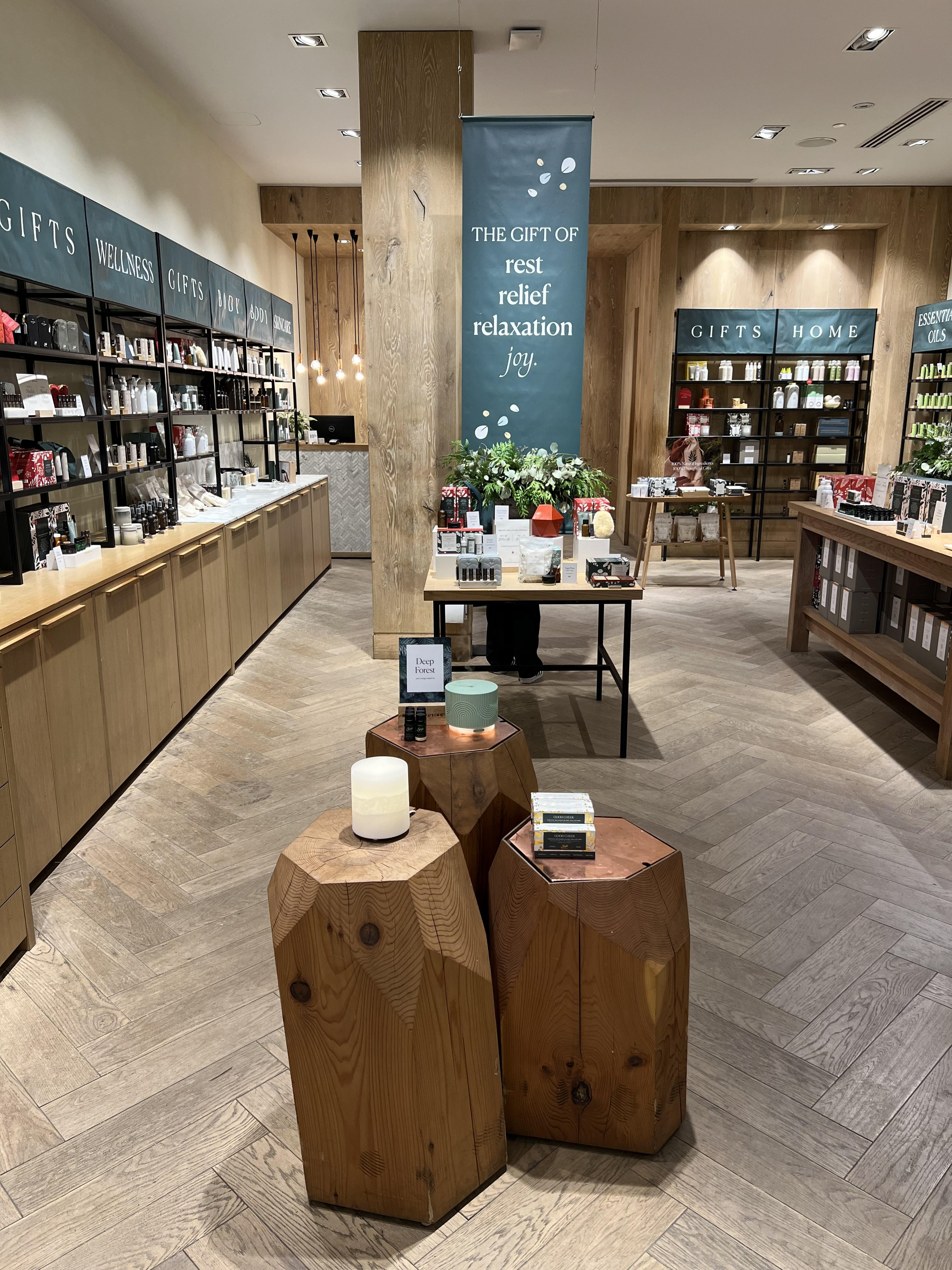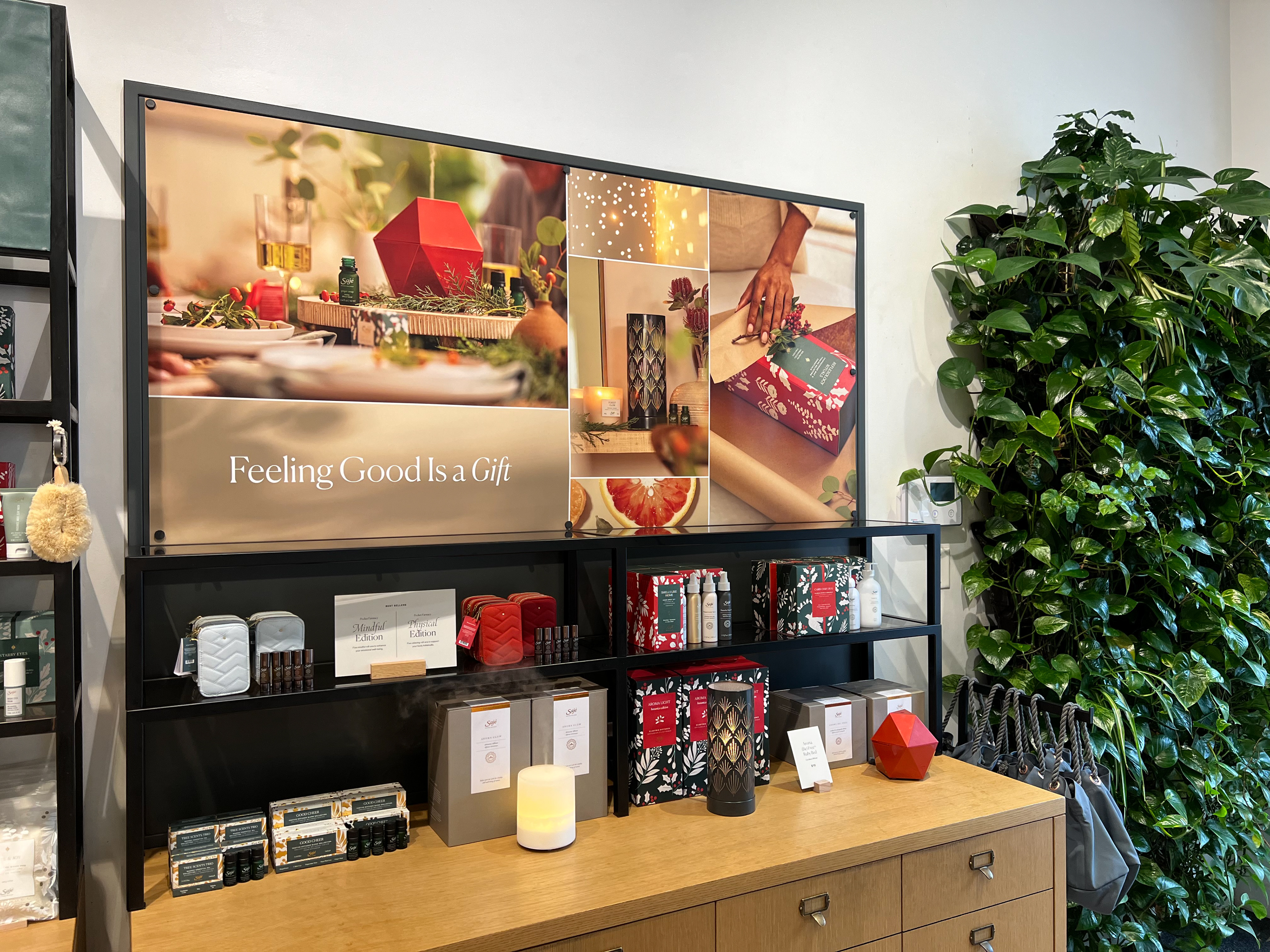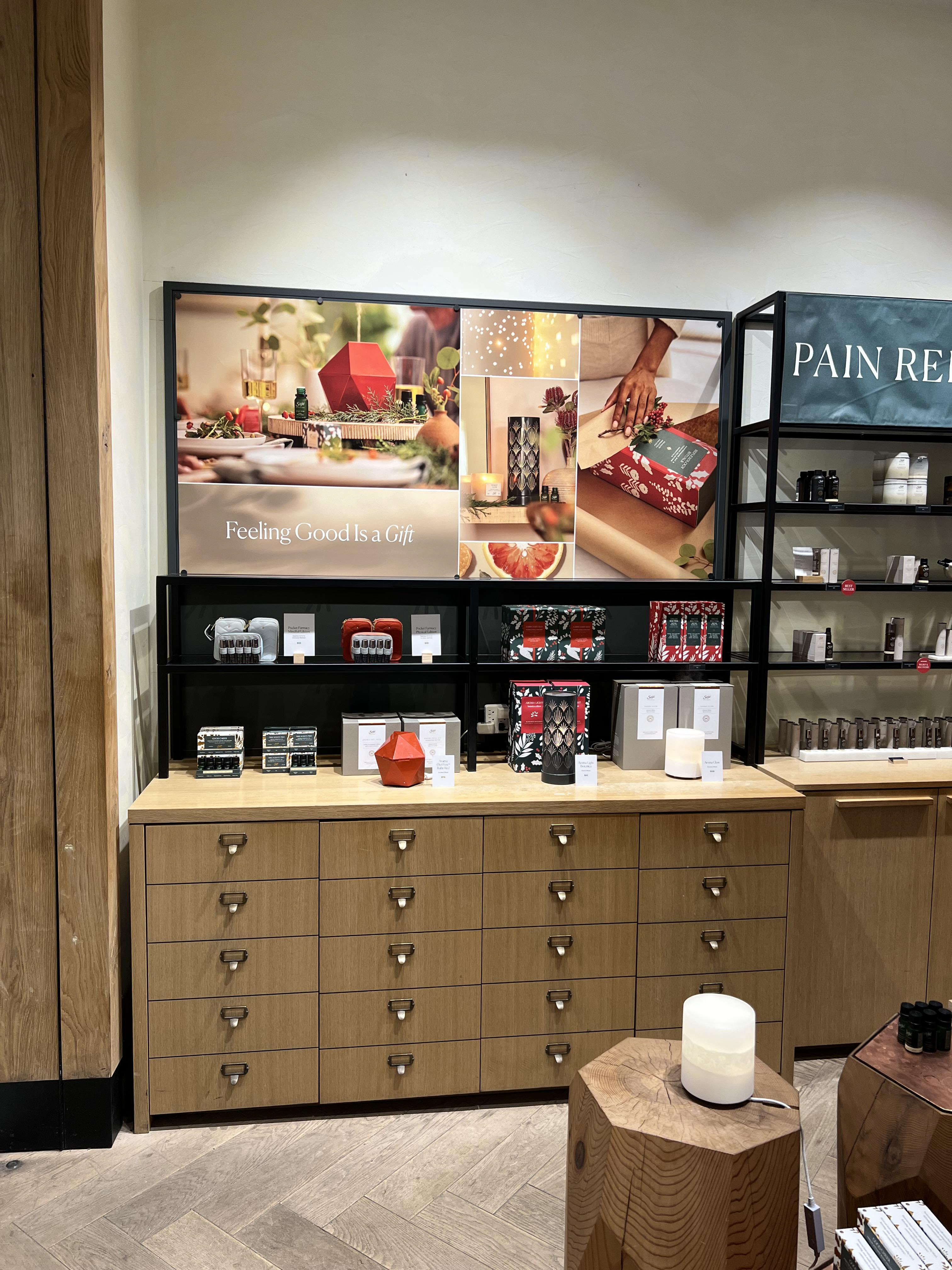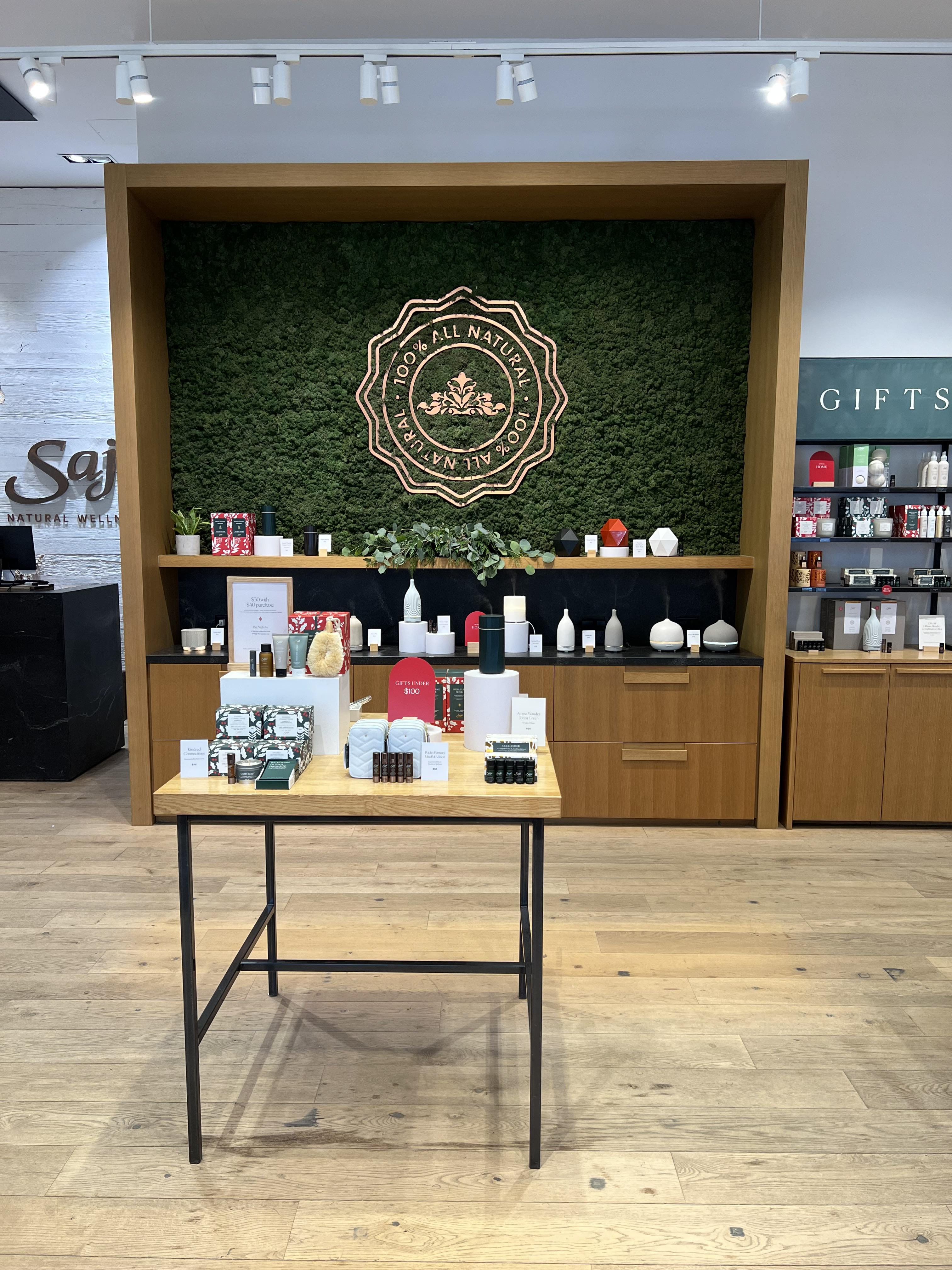 RETAIL VISUAL MERCHANDISING | Wellness Retail - Visual merchandising project management for Holiday 2022 - Spread Joy, Gift Saje marketing campaign, inspired by product packaging. - Storytelling touch points: Front of Store, Windows, Primary & Secondary Table, Blend Bar, Remedie Bays, and Easy Essential Table.